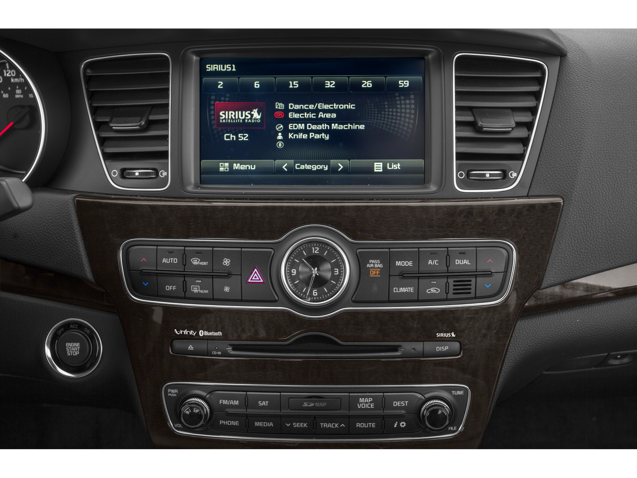- Radio: INFINITI Audio System w/AM/FM/CD/MP3/NAV -inc: 8-inch screen, HD Radio, SiriusXM Radio w/3-month trial, UVO eServices Telematics w/My Car Zone, which includes Speed Alert, Curfew Limit Alert and Geo Fence Alert, Trip Information, USB/auxiliary input jacks, Bluetooth® wireless technology w/audio streaming, 550-watt Infinity audio system w/Discrete Logic 7 surround sound, 12 speakers and subwoofer